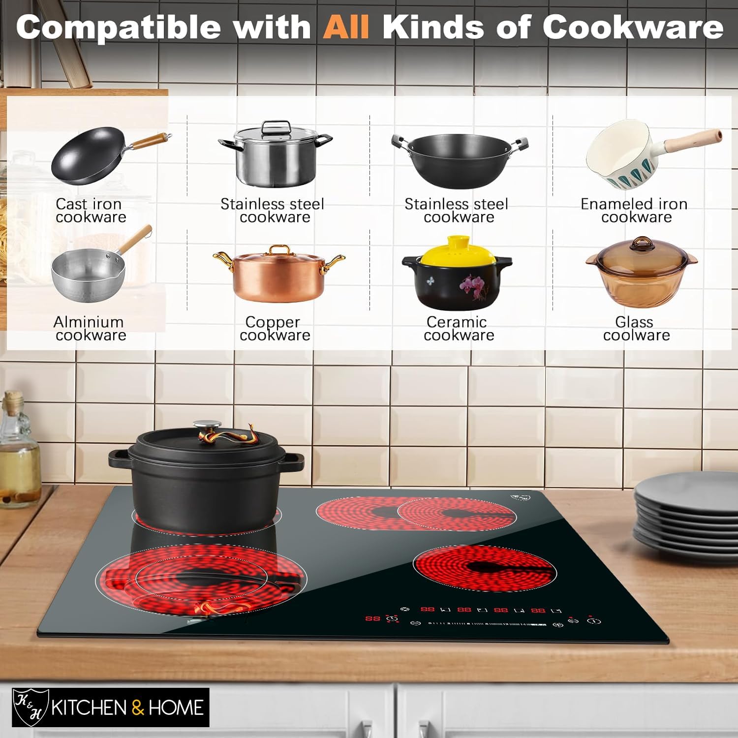 - FOR ALL COOKWARE Four burners electric built-in stove top with scratch-resistant ceramic glass top. Compatible with any kind of cookware which will be one of the important decisions to buy this raised.